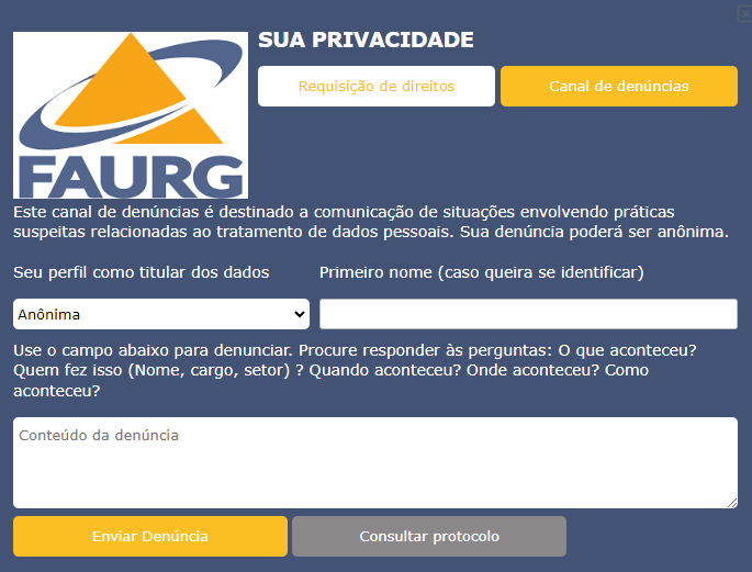 Este canal de denúncias é destinado a comunicação de situações envolvendo práticas suspeitas relacionadas ao tratamento de dados pessoais. Sua denúncia poderá ser anônima.