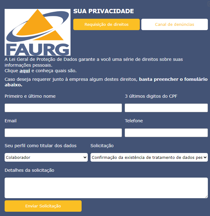 Para requerer seus direitos, basta clicar no botão na lateral esquerda do site SEUS DIREITOS, clicar em REQUISIÇÃO DE DIREITOS e preencher o formulário.