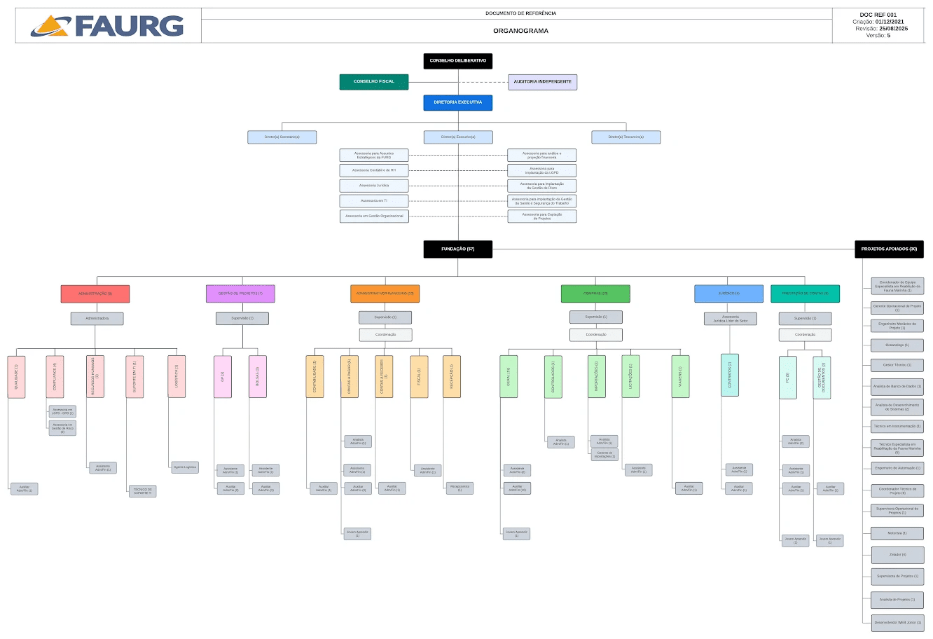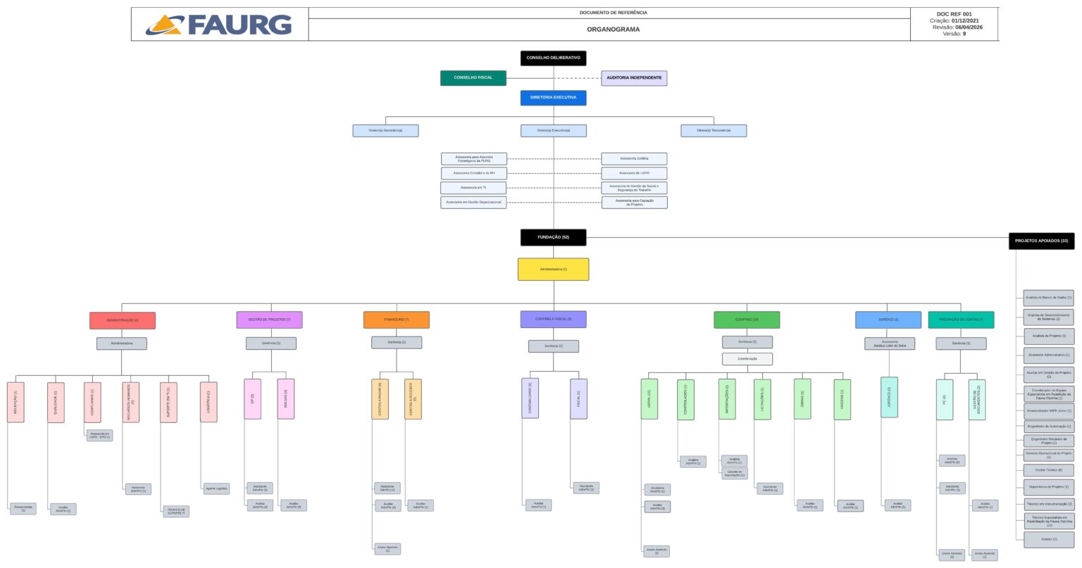 Aqui você pode baixar o organograma da FAURG e conhecer melhor a estrutura da nossa Fundação. O organograma mostra como as equipes estão organizadas e conectadas para apoiar os projetos de ensino, pesquisa e extensão. Baixe o arquivo e entenda como cada setor contribui para o nosso trabalho e compromisso com a comunidade acadêmica e científica!